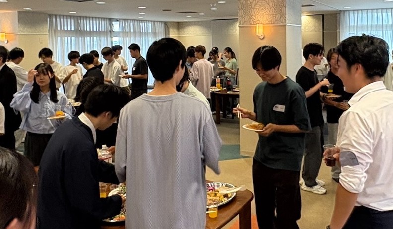横浜三工会のご支援のもと、令和7年 10 月2日に化学応用 EP2年生対象の歓迎会を大学会館3階ポルティにて開催いたしました。 この会は 2年生が化学応用 EP へ配属されたことを歓迎しての開催されるものです。今年は、参加者の参加し易さを考え、例年の夕方開催と異なり、 お昼休み時間に開催いたしました。学部2年生と化学応用 EP教員、そして研究室に所属している4年生や修士学生を加えまして、全体で 100 名近くが参加しました。 EP 代表の亀屋教授より挨拶を頂いた後、乾杯を行い、学生間、学生と教員間で会話が大いに盛り上がりました。2年生が教員と直接話すことや上級生 に相談できる機会ができたことは大変有意義でした。ご支援いただき誠にありがとうございました。